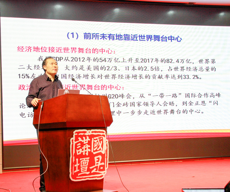 李安增教授在科学梳理十九大报告框架的基础上,围绕十九大重大而深远的历史意义,重点阐述了十九大的六大创新点即新时代、新矛盾、新使命、新思想、新方略与新征程。他指出,2012年党的十八大的召开标志着中国特色社会主义已进入了新时代,中国的经济地位、政治影响力逐步接近世界舞台中心,中国的影响力、感召力与塑造力不断提升,中国正前所未有地接近实现中华民族伟大复兴的目标,时代的划分与判断,是由一定的生产力发展水平决定的,特别指出我们并非回归盛唐,而是在当今时代通过从横向与纵向对比实现中华民族的伟大辉煌;随着时代的发展,我国的主要矛盾已转变为人民日益增长的美好生活需要和不平衡、不充分的发展之间的矛盾,同时指出我国仍处于并将长期处于社会主义初级阶段、我国目前仍是世界最大的发展中国家;通过对十九大主题的解读及苏联解体深刻教训的总结,强调中国共产党领导的正确性,并对习近平总书记提出的“伟大斗争”的科学含义进行了解读;习近平新时代中国特色社会主义思想写入党章,体现了马克思主义理论与时俱进的理论品质,提出了向总书记“看齐”的八个着力点,学习他坚定不移、高度自信、矢志不渝的信仰追求,学习他宽厚仁爱、情真意切、发自内心的爱民情怀,学习他胸怀全局、放眼世界、着眼长远的宽广思维视野,学习他忧党忧国、直面问题、勠力复兴的担当精神,学习他应对严重危机、处理棘手问题的决断力,学习他实事求是、勤勉踏实、一张蓝图干到底的务实作风,学习他严以修身、以身作则的模范行为,正确处理个人、家庭、党和国家关系的道德品格;习近平新时代中国特色社会主义思想主要是“八个明确”和“十四个坚持”,“八个明确”是基本内容,“十四个坚持”是基本方略;新时代、新征程,即新的“两步走”战略。