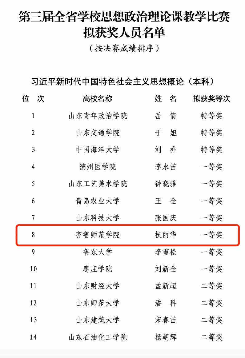 近日,省教育厅公布了第三届全省学校思想政治理论课教学比赛获奖结果,齐鲁师范学院马克思主义学院副教授杭丽华获《习近平新时代中国特色社会主义思想概论》本科组一等奖。