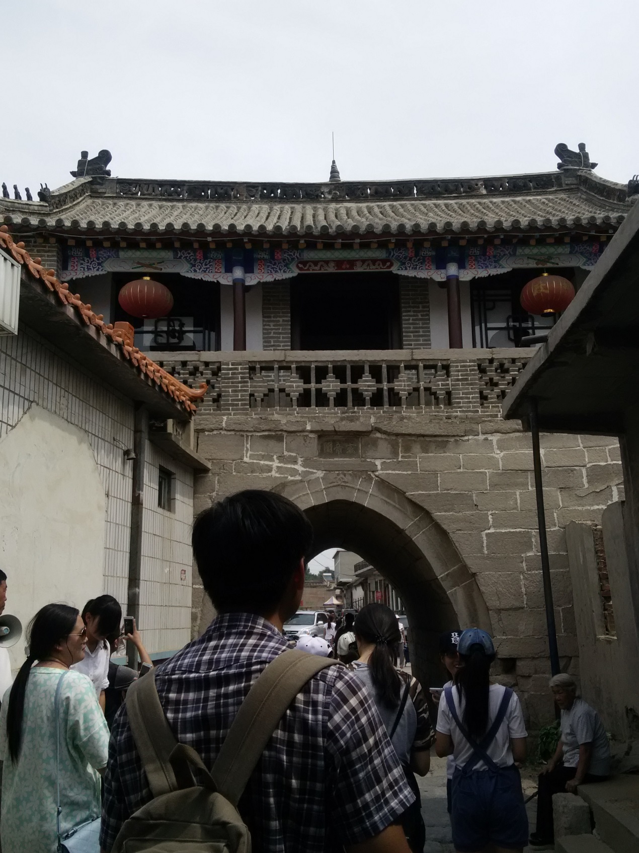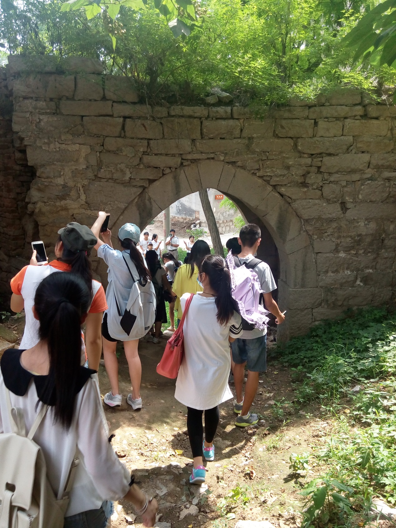 艮峯门是同治年建的。《周易》中,艮是山峰的意思,过去修建此门时,东北方的山峰,现在已经了无踪迹。但过去有很多老城墙,门也很多。当时三德范有四个城门,太平、直平、和平、清平,门的左侧和右侧都是三德范老城墙的遗址。离开艮峯门,穿过几条巷子,我们遇见了几位土生土长的三德范村民,同学们热情的上去采访。