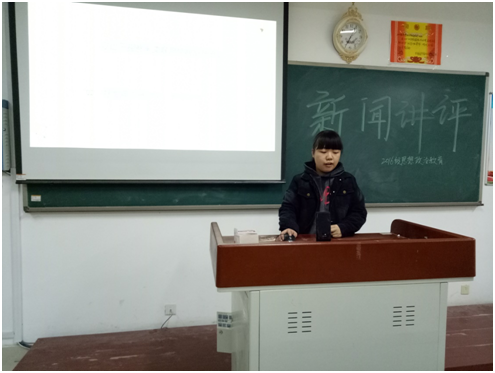 活动开始,由各组代表上台讲评新闻。这次新闻讲评的内容分国内新闻和国际新闻。在国际新闻方面,主要提到了自十九大以来引起广泛关注的新闻事件,那就是美国总统特朗普的亚太之旅。这次亚太之行比较重要的一站就是中国之站,特别是在十九大刚刚闭幕不久,这次访华便被赋予了比较特殊的意义。当然,在这个特殊的时期,俄罗斯总理梅德韦杰夫也与中国进行了第二十二次定期会晤,中国的十九大后总结的经验值得其他国家借鉴。在这次新闻讲评活动中,还提到了有关我国空军方面的新闻,还以宣传片的形式向同学们展现了我国的军事的装备以及空军的军人素质,给同学们以极大的震撼。