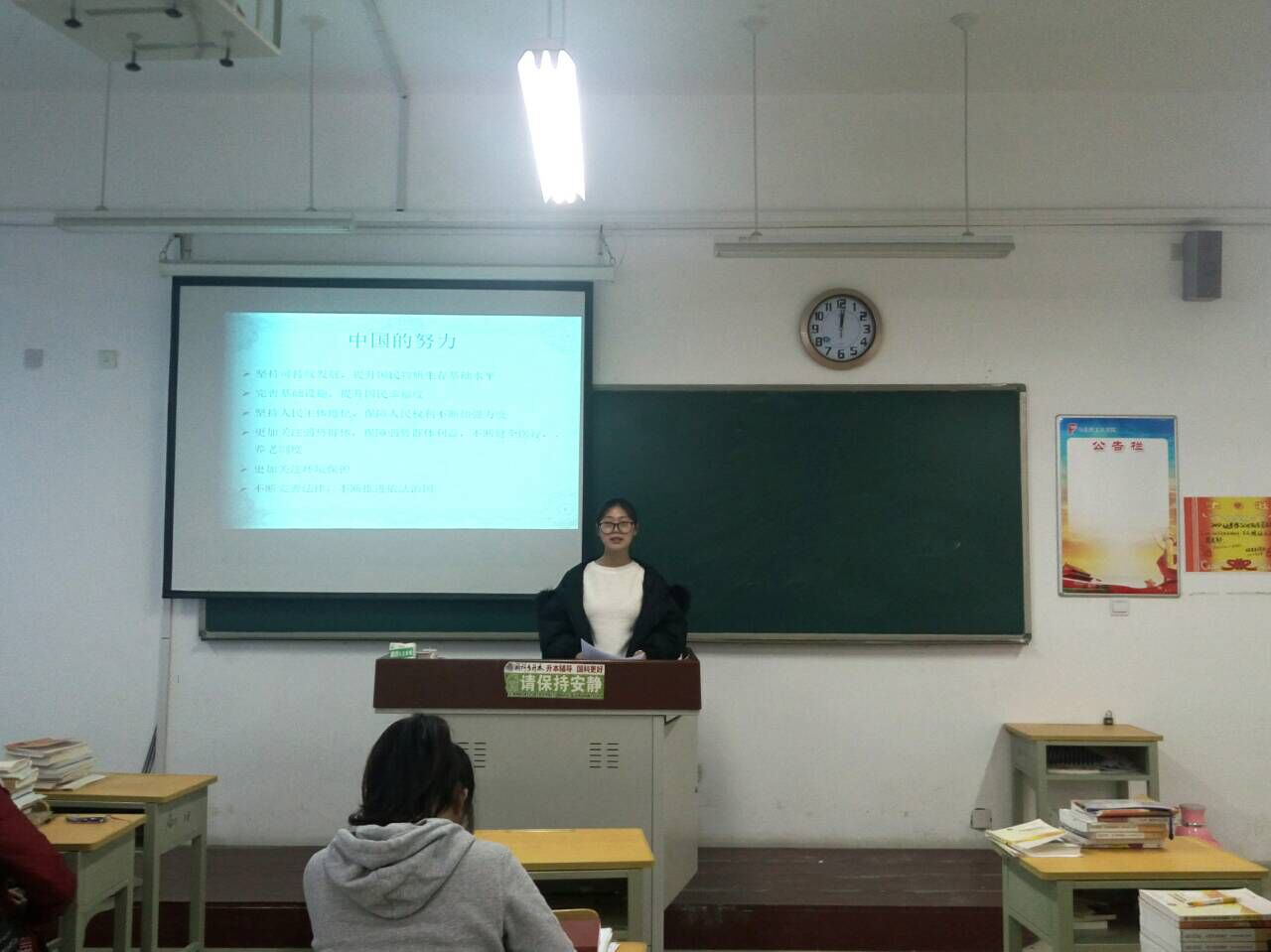 本次政治学习开始,陈雨请同学们阐述了自己对《发展权利宣言》的了解和认识。在大家的积极参与中,陈雨引出了本次活动主题,讲解了《发展权利宣言》的主要内容,并以视频形式,直观形象的向大家展示了《发展权利宣言》的重要意义。随后,张曼玉讲解了中国在世界发展方面做出的努力及中国为全球减贫事业作出的积极贡献。另外,就本次纪念《发展权利宣言》的主题,张曼玉提出,作为当代大学生,不仅要回顾历史,更要展望未来,将国家发展作为己任,为国家强大而献出自己的力量。