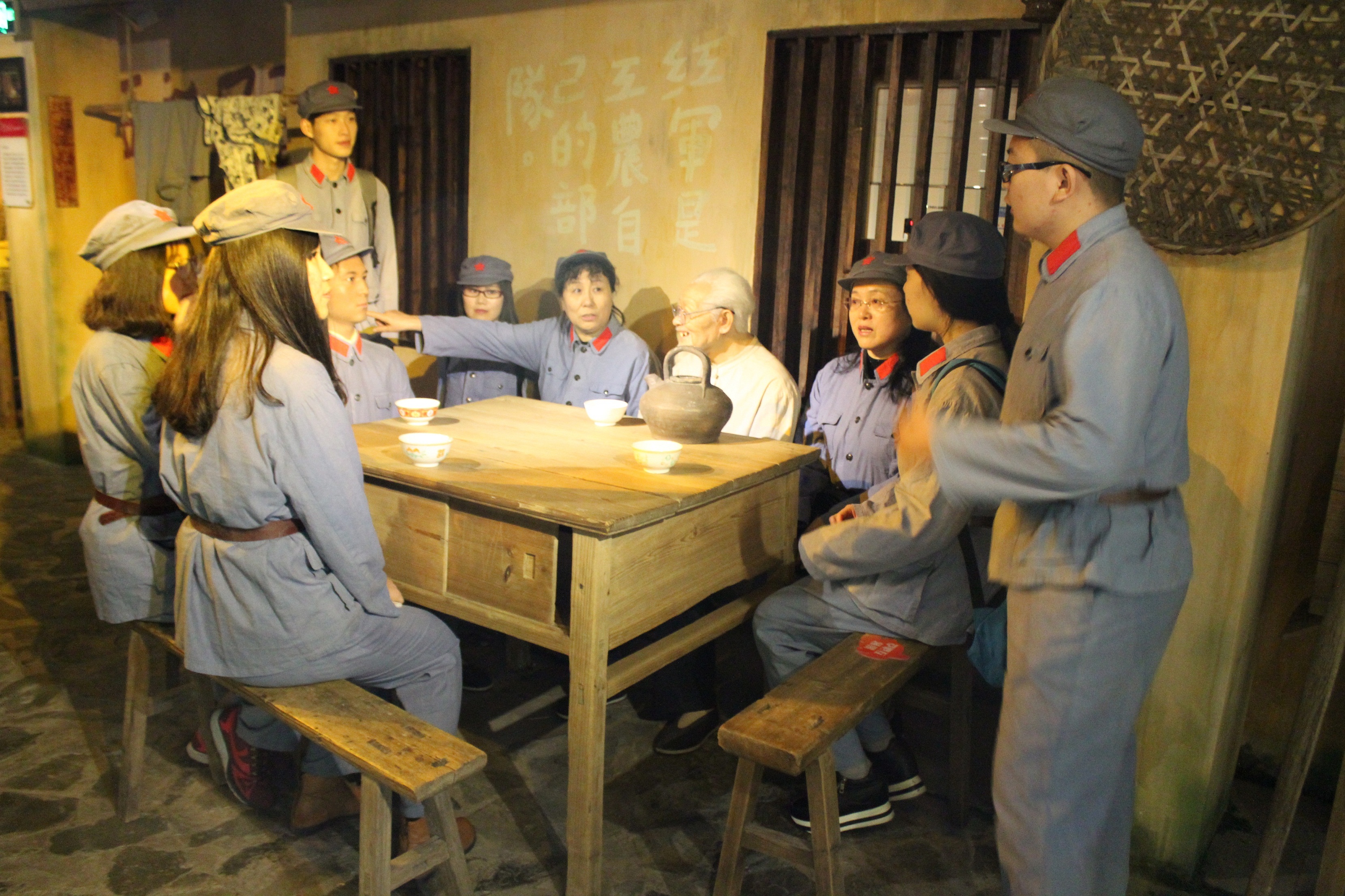 在星火燎原红色体验馆,我们身着红军服装,重走了一遍红军爬雪上过草地的“长征路”,犹如身临其境地体验了二万五千里长征的艰难险阻,同时也学得了红军战士“一不怕苦,二部怕死”的革命精神。当年渡江数次,次次危险重重,突破敌军沿大江大河设置的一道又一道封锁线,血染江河。爬雪山时,红军不仅要战胜雪山阻挡和恶劣气候的侵袭,更加严重的是缺粮断炊的威胁。过草地时,遍地是水草沼泽泥潭,陷入沼泽更是苦不堪言甚至面临全军覆没的危险。通过实景体验,深刻的体验了长征的极其艰苦的过程。红军将士在长征途中表现出了对革命理想和事业无比的忠诚、坚定的信念,不怕牺牲、前赴后续的精神以及无产阶级乐观主义精神一次次的激励着我们。中国共产党在历练中涅火重生,才能保全自身,建立丰功伟业。在我们“重走长征路”的途中,偶遇央视纪录片《记住乡愁·古田》的拍摄组,对我们的活动进行了航空特拍,此内容央视将在明年3月份播出。给我们此次活动添上了浓墨重彩的一笔。