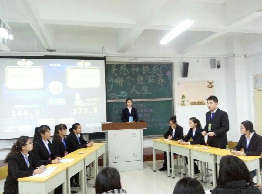 2015年12月8日,我院在六届大学生辩论赛初赛获胜后,经过一周多的认真准备迎来了更为激烈的复赛。此次辩题为“美感与快感哪个更滋养人生”。我院为反方,观点是“快感更滋养人生”。数学学院学生会副主席李泉伦、文学院学生会副主席张莉、音乐学院学生会学习部部长谢青、纵横辩论协会素质拓展部副部长孙燕明和社团联合会宣传部部长谭晓琪出席并担任此次辩论赛的评委。