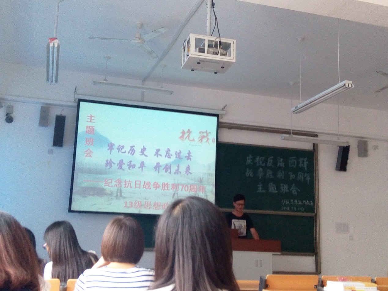 2015年9月10日,2013级思想政治教育的全体同学在二号教学楼A501召开了“庆祝反法西斯战争胜利70周年”的主题班会。