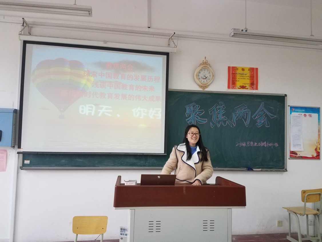 2018年3月15日,我院2016级思想政治教育本科班在2号教学楼A308教室进行了以“聚焦两会”为主题的政治学习活动,耿秋明主讲了本次政治学习的主要内容——中国教育。