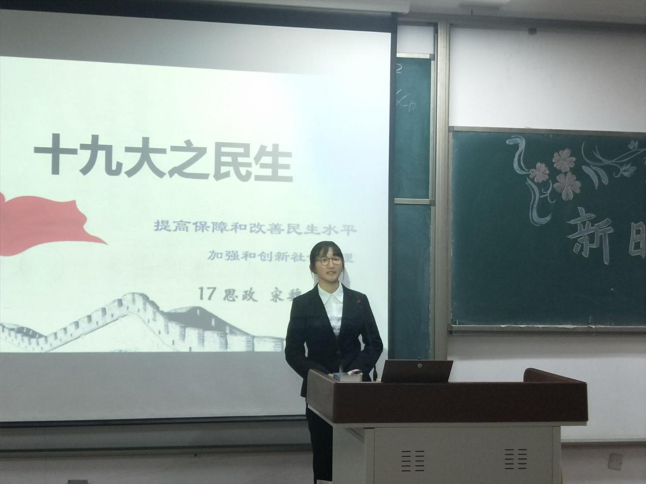 卢洪瀑首先向大家介绍了五年来中国经济发展取得的重大成就,他从中国经济社会发展亮点、实体经济、提升经济创新竞争力三个方面展开,介绍了新中国经济发展取得的累累硕果以及下一步经济发展需注重的问题,他还着重讲解了党的十九大对中国经济发展的新设想。邵慧美从新中国建立以来我国的外交发展历程讲起,强调了中国顺应经济全球化发展潮流,坚持与各国互利共赢和共同发展,同国际社会一道努力,推动建立以合作共赢为核心的新型国际关系,推动多边外交发展。臧叶蕾介绍了以中国特色解决民族问题的正确道路,统一多民族国家是我国基本国情,在新时代我国仍要团结各民族,巩固边疆坚持各民族共同团结奋斗,实现各民族共同繁荣。宋魏宏则主要解读了民生方面,在习近平新时代我国要继续改善和提高民生水平,加强和创新社会治理,打赢脱贫攻坚战,打造共建共治共享的社会治理格局。安颖鑫就十九大进行的党章修改进行了介绍,十九大将习近平新时代中国特色社会主义思想、中国特色社会主义文化、推进国家治理体系和治理能力现代化等写入党章。