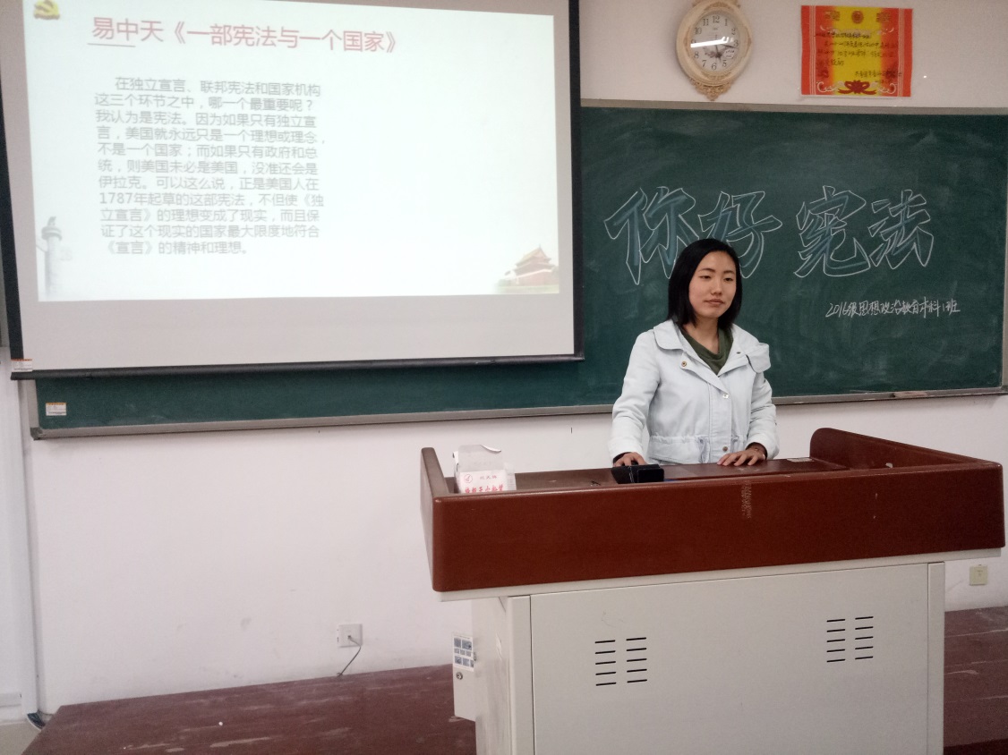 2018年4月10日,马克思主义学院2016级思想政治教育本科班在2号教学楼A308教室进行了以“你好,宪法”为主题的政治学习活动。本次活动由2016级思想政治教育本科班全班学生参加,团支书陈宏银主讲。
