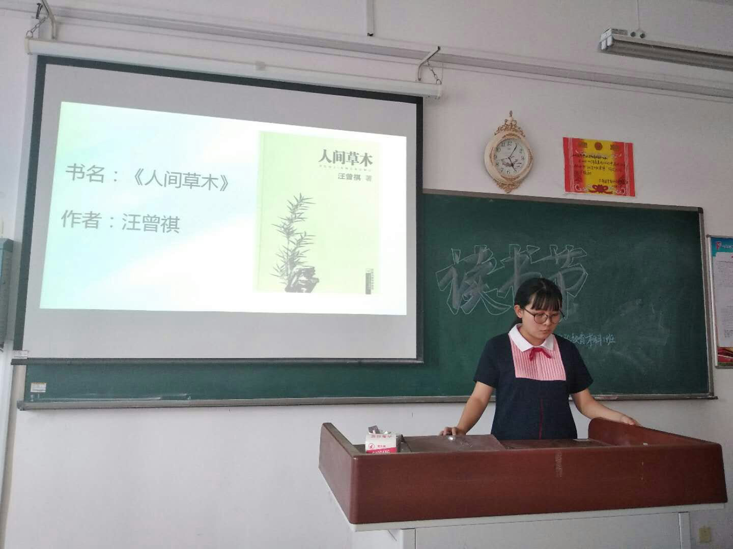 活动以展示分享的形式进行,以小组为单位,小组代表向同学们分享有积极意义的书籍。书籍的内容丰富多样,题材也不尽相同,其中有名家经典作品《人间草木》,这本书是汪曾祺写他的旧人旧事、旅行见闻、各地风土人情、花鸟虫鱼的经典散文集,字里行间充分流露出他对凡人小事和乡土名俗的深深眷恋和对旧日生活情景的缅怀;还有讲到现代人应该学习的书《不抱怨的世界》主讲人分享到,抱怨是最消耗能量的无益举动。有时候,我们的抱怨不仅会针对人、也会针对不同的生活情境,表示我们的不满,而且如果找不到人倾听我们的抱怨,我们会在脑海里抱怨给自己听;也有充满哲思又极为人性化的书籍《我与地坛》,主讲人在谈到作者时提到他的写作与他的生命完全同构在了一起,在自己的“写作之夜”,史铁生用残缺的身体,说出了最为健全而丰满的思想。他体验到的是生命的苦难,表达出的却是存在的明朗和欢乐,他睿智的言辞,照亮的反而是我们日益幽暗的内心……