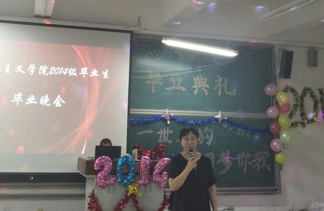 晚会开始之前,刘振光院长和王晓梅书记首先发表讲话。刘院长对2014级思想政治教育本科班顺利毕业表示祝贺,他还讲到:临别之际,送给毕业的同学们三句话,一是讲正气,二是讲政治,三是讲学习,希望同学们在未来的日子里能够牢记这三句话,祝愿大家今后取得更好的发展。王书记的讲话对2014级同学的努力与付出表示了肯定,她讲到:同学们在各个方面都非常优秀,为我院发展做出了很大贡献。王书记同时表示希望同学们在走向社会后继续发扬团结拼搏,不甘落后的精神,成为更加优秀的人才。