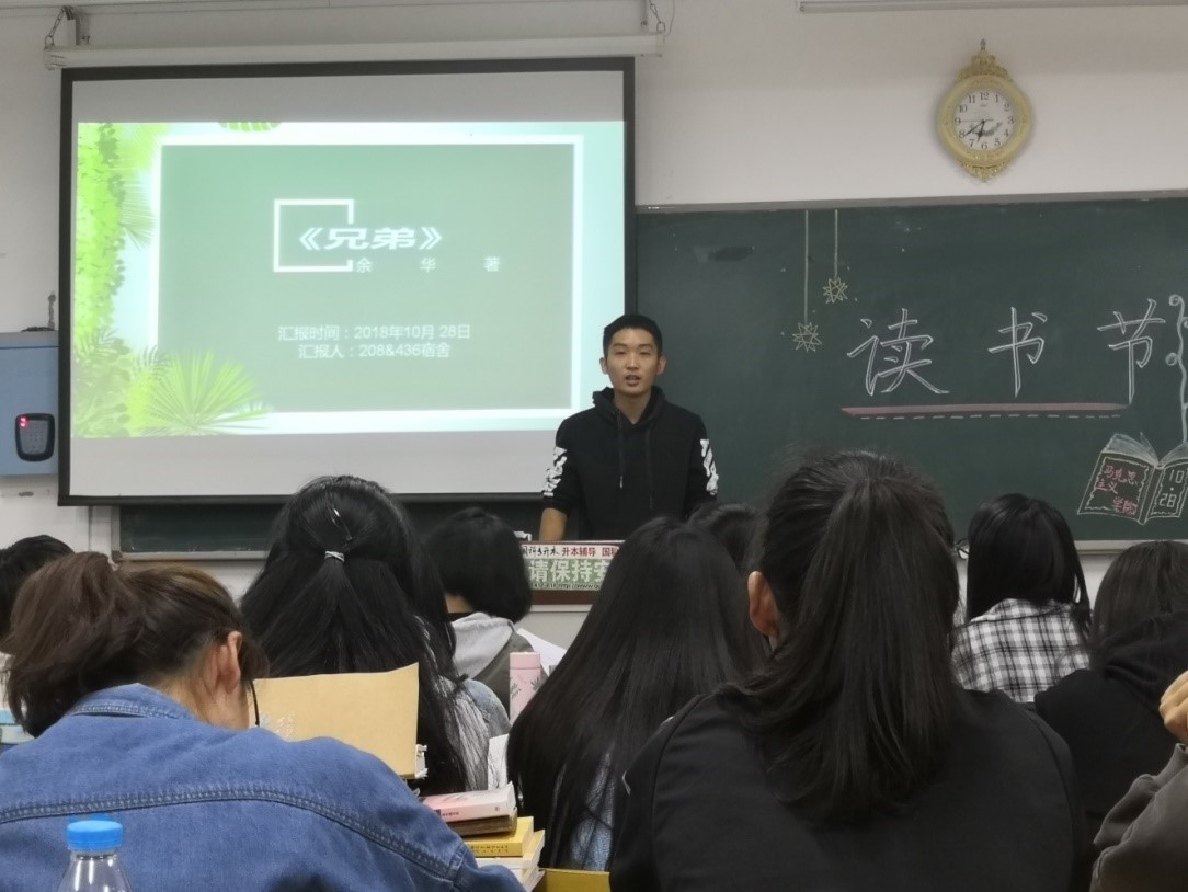 本次读书节活动同学们积极参加,以宿舍为单位进行读书讨论、总结,各宿舍分别选出一位代表进行读书报告。杨安冉向同学们推荐了沈石溪的一本关于爱、关于生命、关于梦想的《狼王梦》。该书中,作者构建了一个荡气回肠、震撼天地的狼的精神世界;刘宗华向同学们推荐了余华的《兄弟》,该书展现了从文革前到改革开放时期刘镇以及刘镇人民的变化,表现对六七十年代强权的批判,以及对改革开放初期民众精神生活匮乏的担忧和些许的人性关怀;赵延雪向同学们推荐了路遥的《人生》,该书以现实主义的笔法描绘了改革开放年代男主在土地以及城乡姑娘面前的抉择;游敏向同学们推荐了余华的《活着》,该书讲诉了在内战、三反五反,大跃进,文化大革命等社会变革背景下,徐福贵的人生和家庭不断经受苦难,到最后所有亲人都先后离他而去,仅剩下年老的他和一头老牛相依为命的悲惨故事;谭梦雅向同学们推荐了明恩傅的《大国与小民——外国人眼中的中国范儿》,本书生动概括、描述了十九世纪末二十世纪初的中国现实和中国人的性格特征;马雪向同学们推荐了张嘉佳的《从你的全世界路过》,亲情、爱情和友情的故事扑面而来;王慧向同学们介绍了玛格丽特·米切尔的《飘》,该小说以亚特兰大以及附近的一个种植园为故事场景,描绘了内战前后美国南方人的生活。