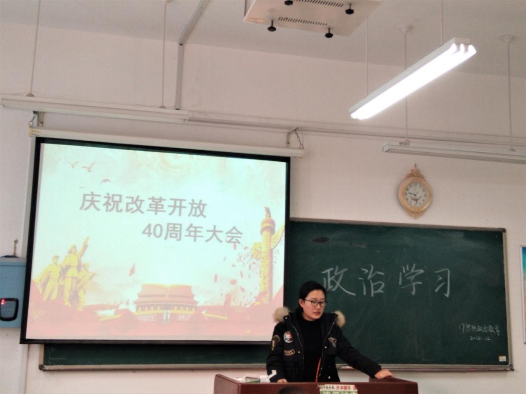 2018年12月18日上午10时,庆祝改革开放40周年大会在人民大会堂举行。中共中央总书记、国家主席、中央军委主席习近平同志发表重要讲话。为了深入了解改革开放四十周年来的伟大成就和宝贵经验,学习习近平新时代中国特色社会主义思想。2018年12月25日,马克思主义学院2017级思想政治教育本科班全体在校生在2号教学楼A311教室进行了政治学习,学习大会有关内容。