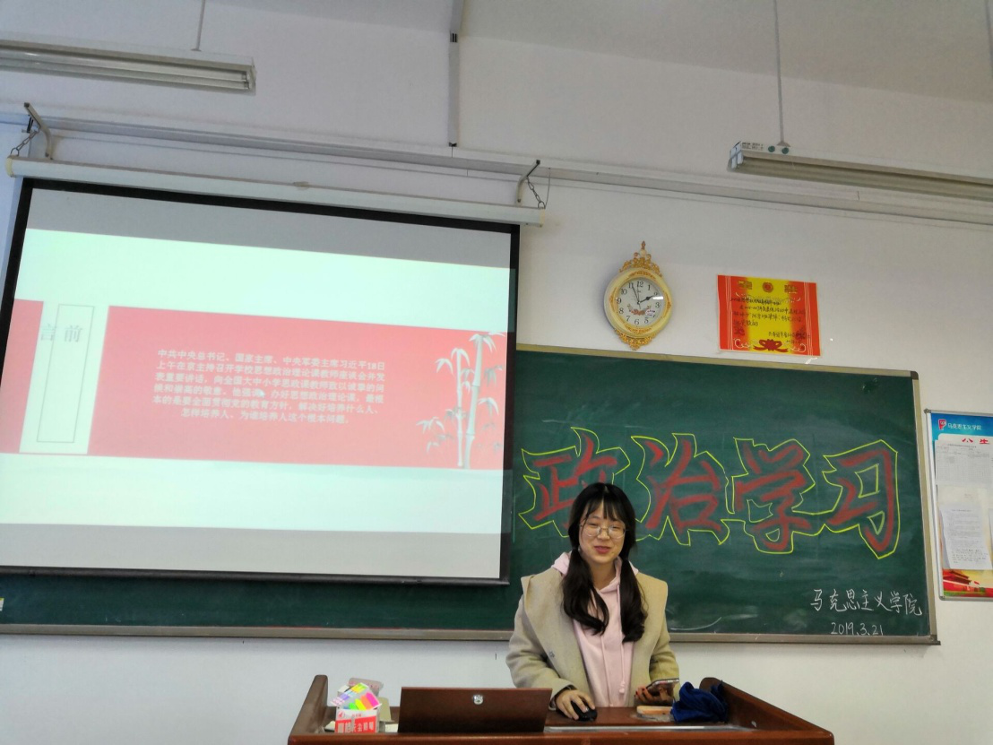 中共中央总书记、国家主席、中央军委主席习近平于2019年3月18日上午在京主持召开学校思想政治理论课教师座谈会并发表重要讲话,向全国大中小学思政课教师致以诚挚的问候和崇高的敬意。为使同学们充分感受学校思想政治理论课座谈会的精髓,3月21日,马克思主义学院2018级思想政治教育本科一班全体学生在二号教学楼A311教室举办政治学习活动。