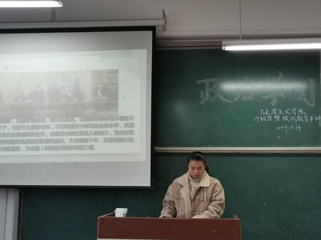 为了解学习习近平总书记就中希友好合作提出的建议和中国对外开放政策,把握中希两大文明古国交流合作的重大意义,2019年11月14日,我院在二教A310举办了以“中希务实合作”为主题的政治学习活动,本次活动由2018级、2019级思想政治教育本科班全体同学参加。