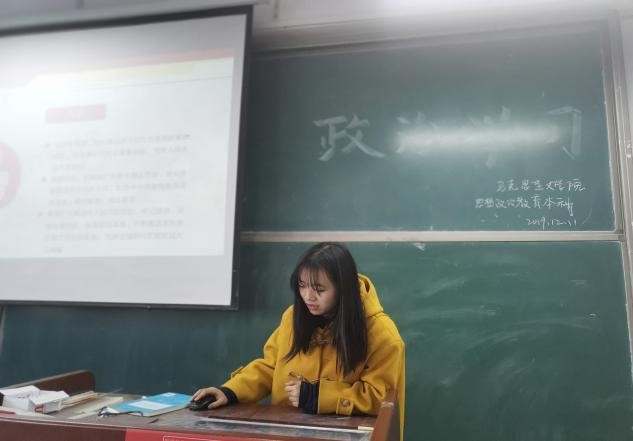 为深入学习习近平主席重要指示,提高同学们的政治素养,树立中国特色社会主义共同理想,2019年12月12日,我院举办以“珍惜光荣历史,永葆政治本色”为主题的政治学习活动,此次活动2018、2019级全体思想政治教育专业本科生踊跃参加。