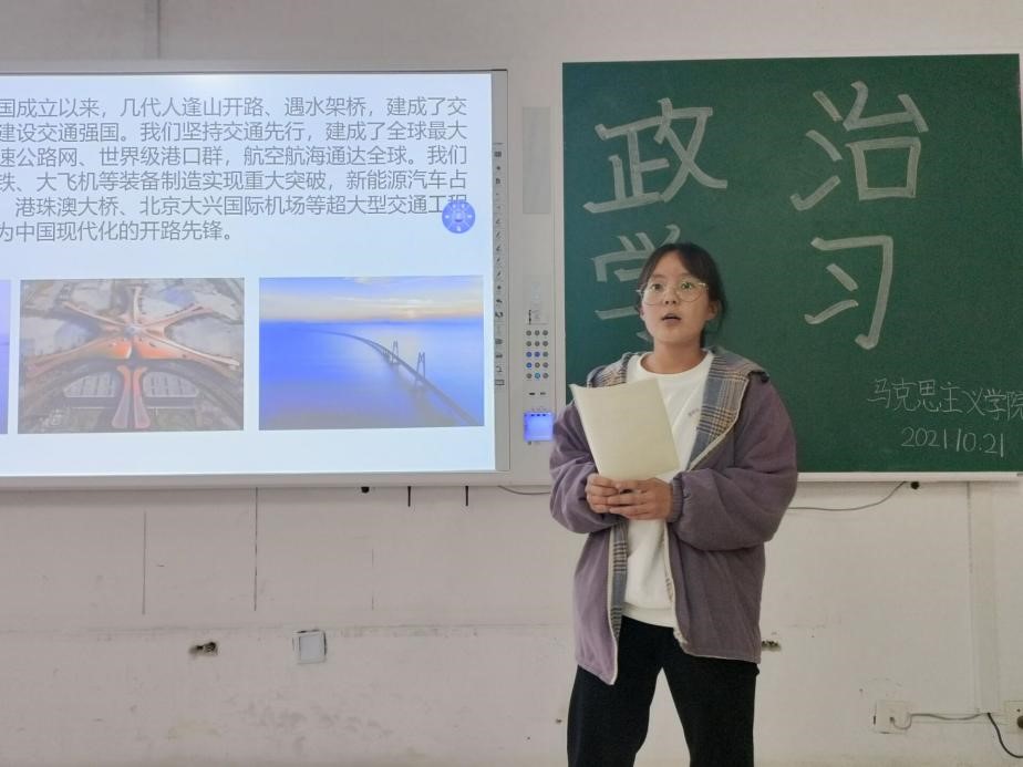 2021年10月14日至16日,第二届联合国全球可持续交通大会在北京隆重举行,“消除贫困”成为各方屡屡提及的关键词。为使同学们深入学习脱贫攻坚精神,把握时代脉搏,提升政治素养,2021年10月21日,我院于2号教学楼A310教室举办了以“减贫脱贫,交通先行”为主题的政治学习活动。参加此次活动的有马克思主义学院2018级、2020级和2021级思想政治教育本科班全体同学。