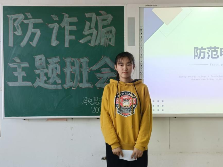 为提高我院学生的安全防范意识,杜绝校园内外诈骗情况的发生,切实做到安全观念常伴你我、防范诈骗人人有责,2021年11月18日,我院2021级思想政治教育专业本科班于2号教学楼A310教室开展了以“铸就防骗长城,擦亮识骗慧眼”为主题的班会。参加此次班会的有2021级思想政治教育本科班全体同学。