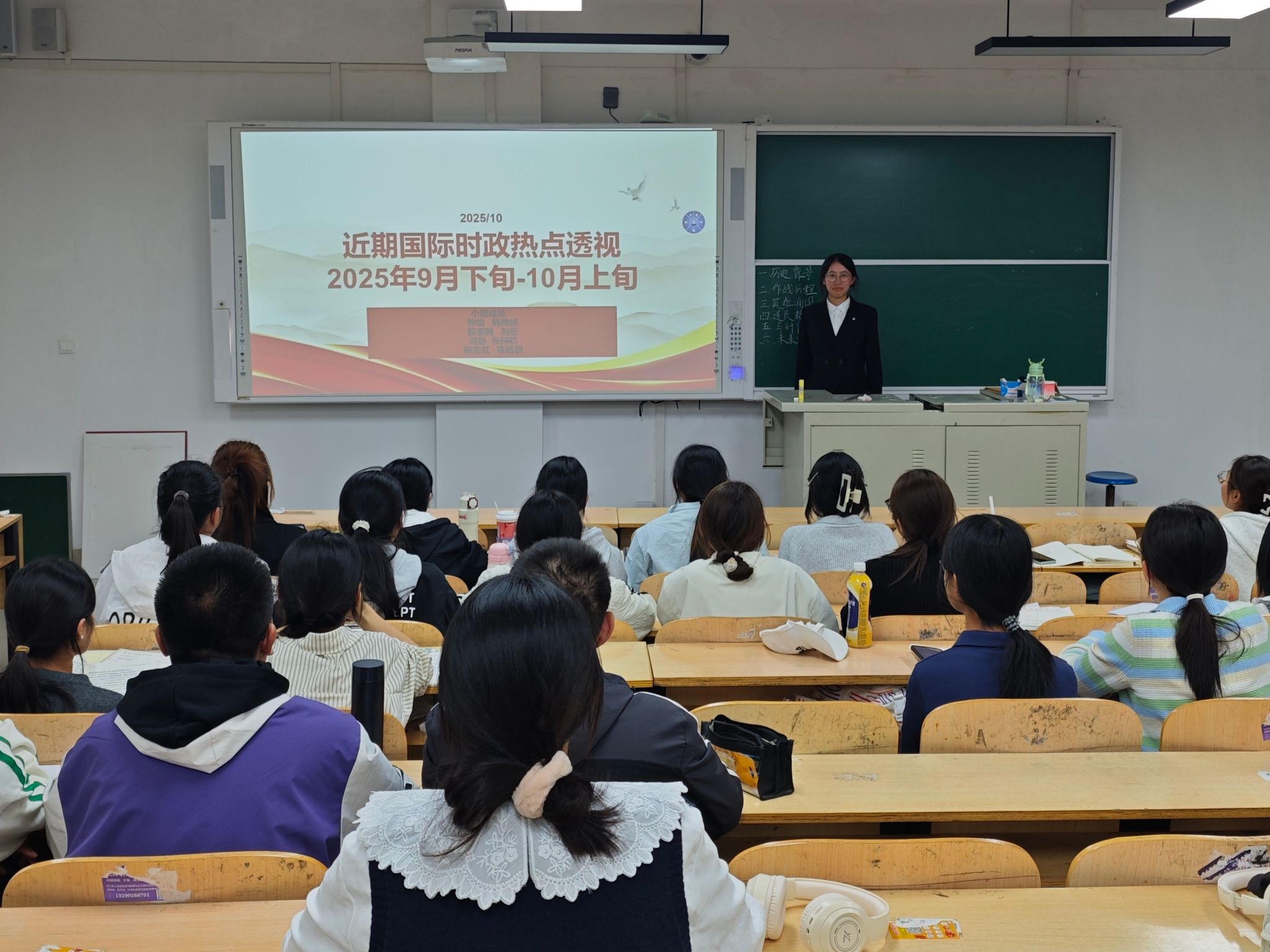 本次时政述评以近期发生的时政热点为主要内容,邹士好、付文硕、崔玉树等九位同学担任主讲人。活动中,邹士好同学讲述了10月9日第十五届全国运动会暨残特奥会火种采集仪式这一新闻,让同学们感受到奥林匹克精神与科技创新、大湾区发展深度融合的时代主题。付文硕同学着眼于10月10日习近平就朝鲜劳动党成立80周年向朝鲜劳动党总书记金正恩致贺电,为同学们讲解了中朝关系不断向前发展,为地区乃至世界和平稳定和发展繁荣作出积极贡献。赵鑫怡同学带领大家围绕10月3日“蛟龙”号在北极成功完成10余次载人深潜展开讨论。李义璇同学介绍了10月11日引力一号遥二运载火箭发射成功这一新闻。崔玉树同学介绍了9月26日神舟二十号航天员乘组圆满完成第四次出舱活动。此外,秦艺瑞、朱丽洁、段家腾等同学也就时政热点进行述评,各位主讲人的精彩讲述,不仅引导同学们以客观理性的视角真切感受国家发展的稳健足迹,更激励大家将个人理想融入时代进程,把家国情怀转化为求真务实的奋斗实践,鼓励同学们以更宏大的格局、更扎实的能力,从容应对未来道路上的种种考验,为实现中华民族伟大复兴的中国梦贡献自己的力量。