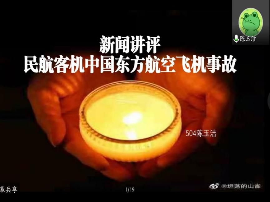 本次新闻讲评活动围绕MU5735航班人员遇难、天宫课堂开课等本周热点新闻展开。活动伊始,张雪雪同学怀着沉重的心情向同学们讲述了MU5735航班遇难事件:2022年3月21日,中国东方航空公司的MU5735客机在执行昆明——广州航班任务时于广西藤县坠毁,机上人员132人全部遇难。事故发生后,南部战区迅速启动应急机制第一时间组织救援力量赶赴现场展开救援。在搜寻工作异常艰难的情况下,搜寻队于3月23日、27日搜寻到两部飞行记录器,为后期技术人员分析飞机失事的原因奠定基础。“我们现在所拥有的今天,是那些人不可得的明天。我们所过的每个平凡的日常,也许就是连续发生的奇迹。我们荒废的今日是昨日陨身之人所祈求的明日”,张雪雪同学通过抒发对于此次事故的感想,希望逝者安息,生者坚强。随后,韩红同学通过播放视频的形式向同学们回答了“什么是天宫课堂”的问题。她指出,2022年3月23日,“天宫课堂”第二课在中国空间站正式开讲并直播,神舟十三号乘组航天员翟志刚、王亚平、叶光富进行授课。在本次授课过程中,“天宫课堂”采取天地互动的方式,三位宇航员担任“太空教师”进行太空冰雪实验,进一步向青少年普及航天知识、弘扬航天文化。韩红同学向同学们强调,“天宫课堂”将浩瀚神秘的宇宙展现在青少年眼前,使他们感知宇宙奥秘,增长航天知识,提高科学兴趣,为实现中华民族伟大复兴作出重大贡献。