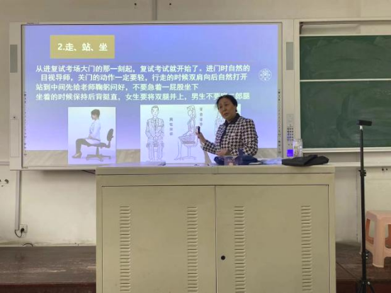 王晓梅教授首先强调了复试礼仪的重要性,聚焦同学们面对的线上、线下复试中存在的常规问题,从面试前的准备、仪容仪表仪态、表达技巧和沟通艺术等方面进行具体讲解,提出自我介绍、双机位摆放、网络调试、面试场所选择、面试着装原则、面试姿态仪容等针对性建议,帮助同学们提高线上面试效率,提升面试礼仪技巧。