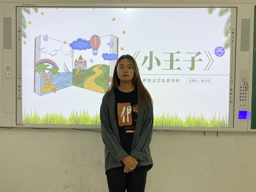 在本次读书节上,侯文卓、刘冉冉、刘雯雯三位同学分享了自己的读书感悟。侯文卓向大家推荐了《小王子》一书,她通过分享充满希望和爱的故事启迪同学们要用心对待友情、亲情、爱情,这个世界上有很多平凡的人,平凡的花,平凡的动物,当你用心去对待时,它就赋予了对你不一样的意义,“我爬得越高,眼前的风景便越发迷人。”刘冉冉向同学们分享的书籍是《怦然心动》,她为同学们分享了此书的优美语句,并希望同学们能够善待自己、热爱生活,勇于直面困难。“被命运碾压过,才懂时间的慈悲。”刘雯雯向同学们分享了经典著作《活着》,她对本书的作者、创作背景、艺术特色、主题思想进行了介绍,帮助同学们理解苦难的意义,获得面对现实的勇气。
