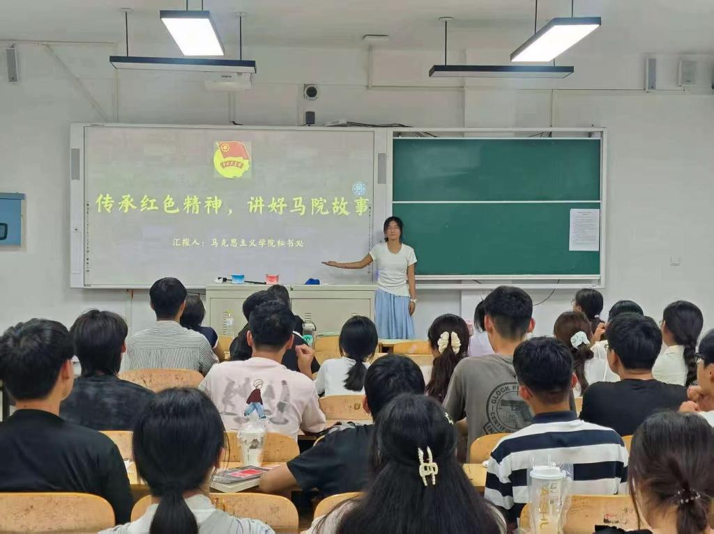 本次院史教育活动由2024级学生会成员徐心彤主讲,她以“传承红色精神,讲好马院故事”为核心主题,紧扣学院发展主线,从“学院创立历史”“发展建设状况”“办学成就与未来规划”三个维度,系统且深入地向新生梳理了马克思主义学院的发展脉络。徐心彤以时间为轴线展开叙事,通过讲述历代马院教育工作者深耕马克思主义理论教学、投身思政育人实践的鲜活故事,生动展现了学院发展历程中的重要事件与精神传承。让新生真切感受马院历史的根脉传承;同时结合学院深化理论创新、推进思政课改革、提升人才培养质量的未来规划,激励新生传承红色基因、勇担时代使命,为学院发展贡献力量。同时,徐心彤结合学院未来发展蓝图,激励新生们以院史为鉴、以先辈为范,主动传承红色基因、勇担时代使命,在今后的学习与成长中紧跟时代步伐、锤炼过硬本领,将个人发展融入学院建设与国家发展大局,为马克思主义学院的未来发展注入青春活力、贡献智慧力量。