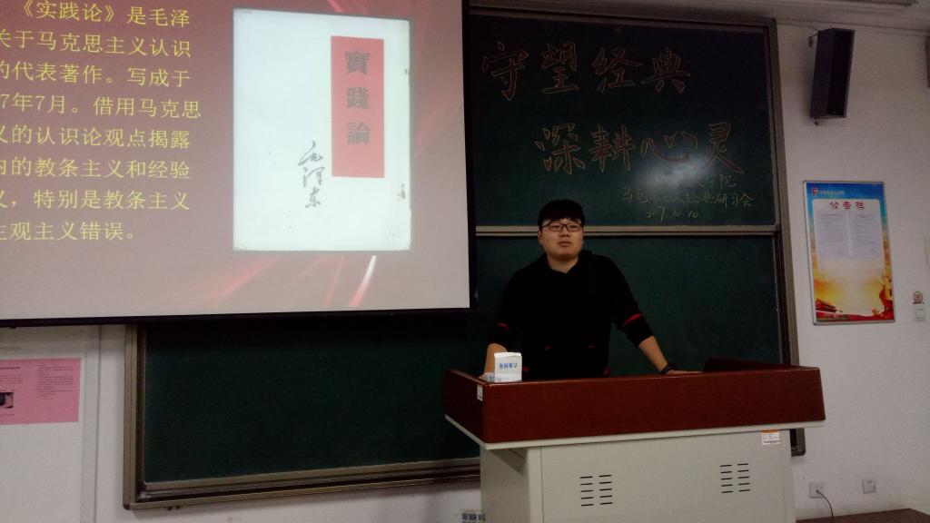 活动伊始,由马克思主义经典研习会前任社长许畅同学发言,以一位前辈的身份讲述阅读哪些马克思主义经典著作以及如何学习。接着,由五位干事以五部著作为例向新社员介绍如何学习经典著作。现任社长陈宏银对《反杜林论》进行讲解,此书主要是恩格斯对杜林反社会主义观点的批判,并提出注重宏观分类的阅读方法。干事李昌硕带来的经典著作是《实践论》,以抓住实践这一重点论述了毛泽东对马克思主义认识论的众多观点。