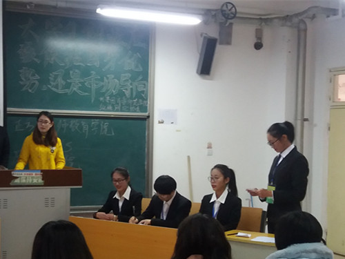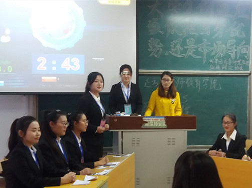 2017年11月21日,下午3:50,在二教A509举行了辩题为“大学生创业应该依据自身优势,还是市场导向”的校辩初赛第二场的辩论赛。正方为教师教育学院对阵反方为文学院,此次辩论特邀 “章丘杯”辩论赛冠军顾坤,马克思主义经典研习会会长陈宏银,化学与化工学院学习部副部长张新敏。双方辩手的表现展现了现场应变,语言表达等专业技能的积累和新时代的风采,给我们带来了一场视觉盛宴。