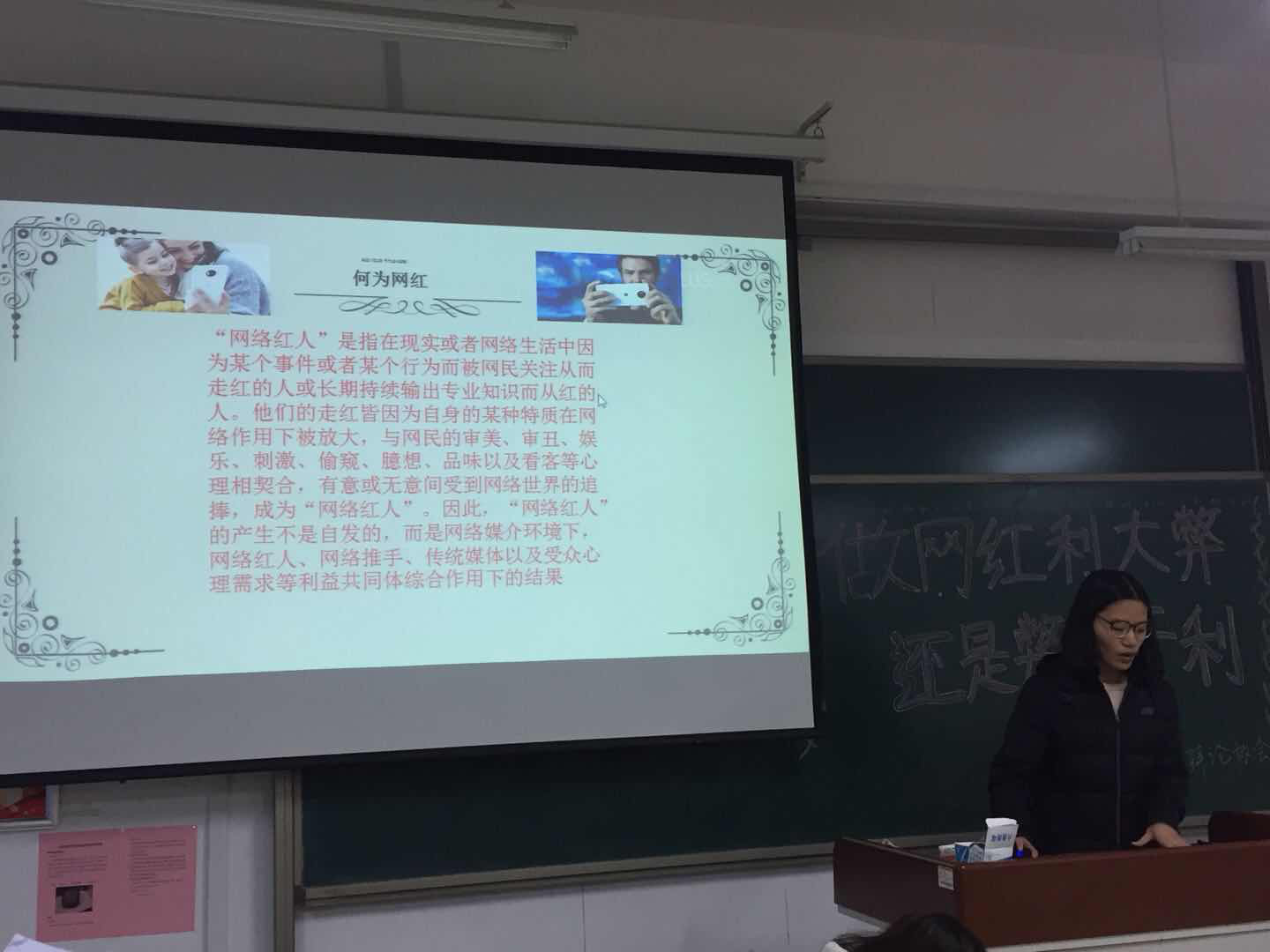 2017年11月16日下午5:10,在二教A310举行了辩题为“做网红利大于弊还是弊大于利”的辩论赛,此次辩论赛由纵横辩论协会副会长赵懿一、张越担任评委。