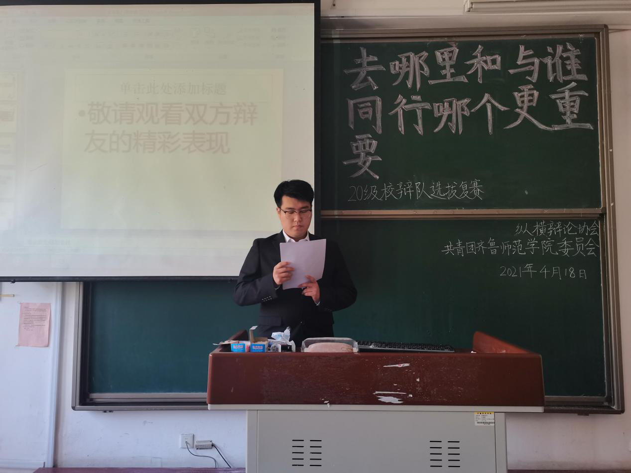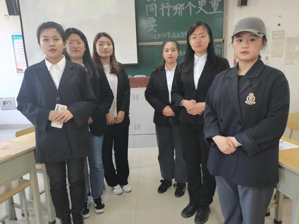为进一步选拔校辩队成员,选拔赛复赛于2021年4月18日上午9:30在二教A310举行。本场比赛的辩题为:“去哪里和与谁同行哪个更重要”,正方所持观点为“与谁同行更重要”,反方所持观点为“去哪里更重要”。本场比赛由2019级校辩队成员郭本慧、丁帅、张梓彤、窦皓文、项志鹏担任评委。