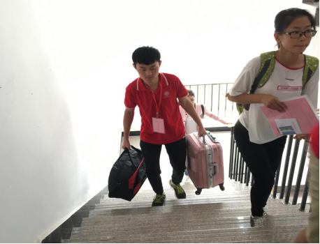 迎新服务人员帮助新生搬运行李