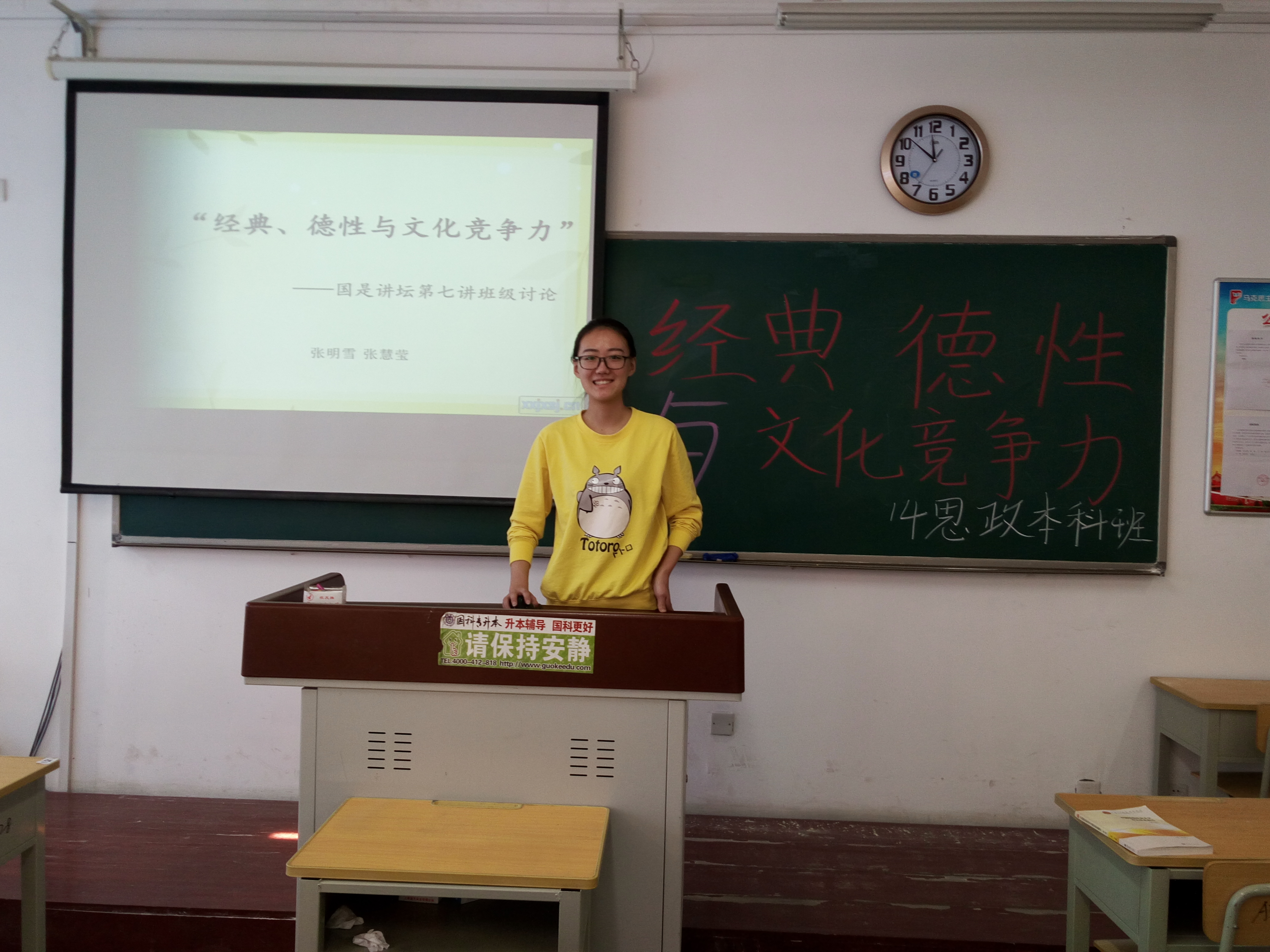 2016年11月17日,2014级思想政治教育本科班在二教A311教室进行了关于“经典、德性与文化竞争力”的政治学习。本次活动由2014级思想政治教育本科班全体同学参加,张明雪主讲。