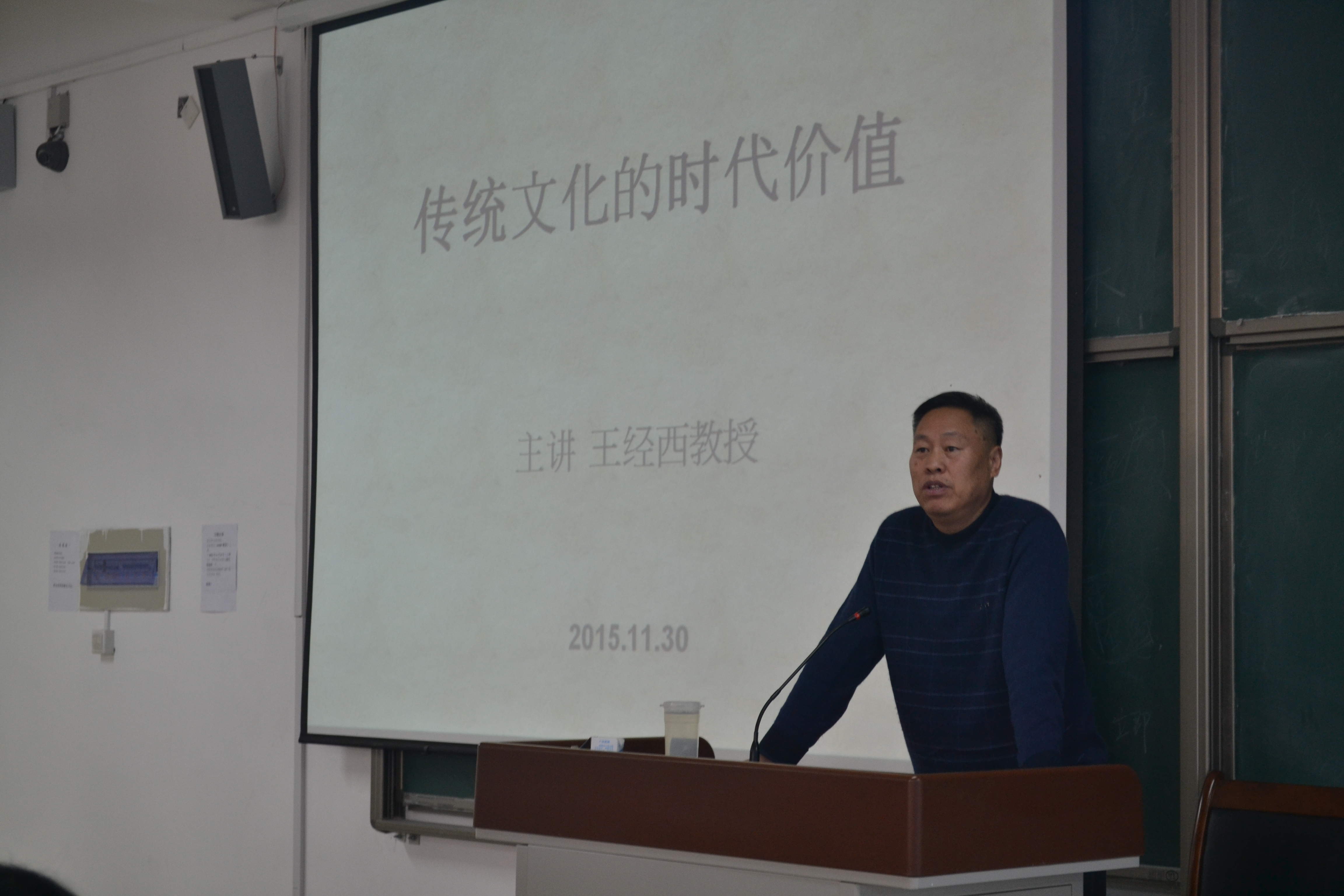 王经西教授现任山东省中国特色社会主义理论体系研究中心主任,是国内特色社会主义理论体系研究的知名专家,首批入选山东高校思想政治理论课特聘教授师资库的“特聘教授”。王教授研究成果丰硕,文章多发表在《红旗》、《求是》等国内主流纸媒及党报学报上。王经西教授的授课内容丰富、语言凝练、深入浅出,从论述习近平总书记为何特别重视传统文化讲起,指出弘扬中华优秀传统文化是顺应人民意愿的时代选择,是共产党对执政规律认识的深化,更是适应中华民族伟大复兴的历史要求。王教授指出,弘扬中华优秀传统文化对于治国理政具有重要的意义,不仅因为中华优秀传统文化是促进世界和平的精神财富,还因为其中蕴藏着解决时代难题的重要启示。最后王教授又结合现实和同学们探讨了学习传统文化对于个人成长的重要意义,提出了文化自觉、文化自信,做坚定爱国者的题中要义,并分享了如何向孔子请教个人修养的法门。尤其在最后讲到孝道乃做人之根本时,引起了师生们的强烈反响与共鸣。