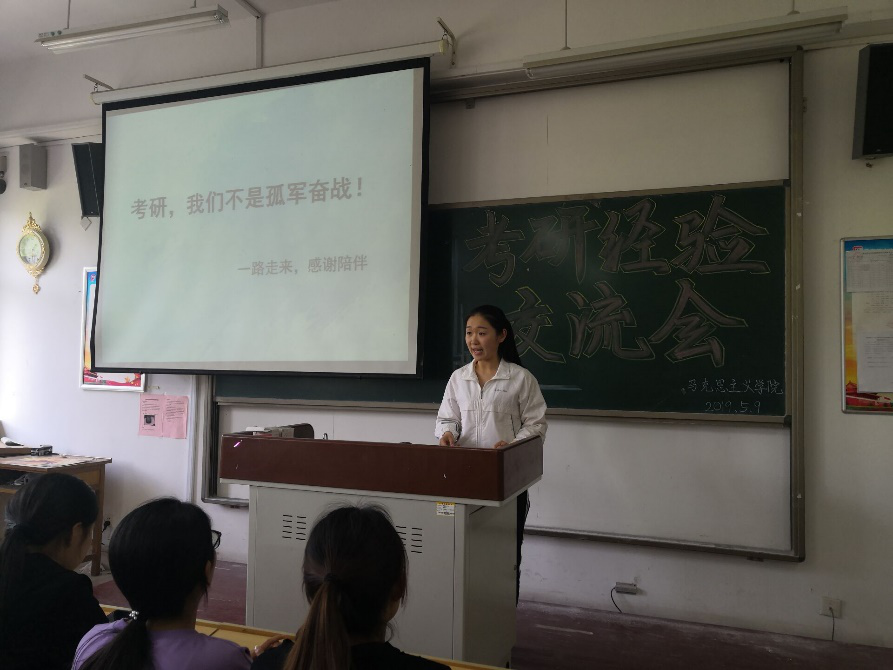 为了让有考研目标的同学们获得更多的考研经验,寻找到能够合作共进、携手并行的研友,2019年5月9日下午,马克思主义学院携手外国语学院在二号教学楼a310教室共同参加考研经验交流会活动,参加本次活动的有马克思主义学院团总支副书记王雅文老师、外国语学院辅导员倪冉老师、主持人许畅同学、八名分享考研经验的大四学长、学姐,以及马克思主义学院和外国语学院有考研意向的同学们。