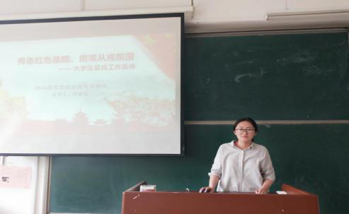 活动中,付爱文向同学们积极动员,认真向同学们讲解征兵的基本条件,要求以及征兵的优惠政策等,号召同学们暂别校园、携笔从戎,到军营中提升自我、淬炼成钢、施展才华、报效国家,书写绚烂、无悔的青春篇章。同时,为了更加方便有意愿参军的同学了解征兵工作的具体内容和细节,付爱文向同学们介绍了部分大学生入伍的事迹,让同学们对大学生征兵入伍有了更加详尽的了解。