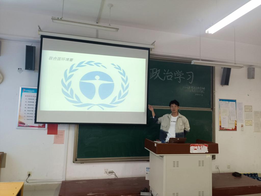 活动伊始,王书征同学使用一张被污染成绿色的河水照片引题,在幽默的话语中向大家阐释了“此绿水非彼绿水”的道理,引发了同学们对生态环境破坏现象的深思。同时,他将个别发达资本主义国家和中国的生态政策与措施作了比较,号召同学们在保护环境的前提下要兼具对国际生态形势政策的了解。在如何保护生态环境的问题上,王书征同学指出,保护生态环境必须围绕在党中央的领导下。随后,池兴隆同学以热带雨林的遭遇为例,生动形象地描述了当前严重的生态破坏现状,加深了同学们的危机感和环境保护意识。池兴隆同学从荒漠化、大气污染、水体富氧化等方面全方位地解释了严峻的生态问题。活动即将结束时,池兴隆同学结合在国际上横行的疫情,提醒同学们勿忘身边的惨痛教训。