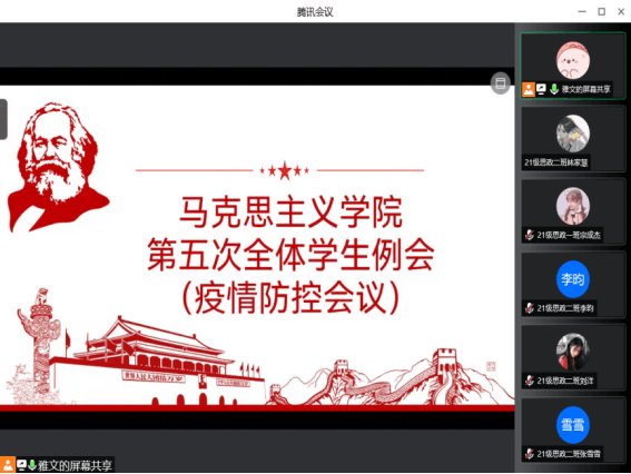 为坚定学生疫情防控的决心,帮助学生树立遵守规则的意识,保持良好心态,2022年5月1日,我院线上举行第五次全体学生例会,与会人员有马克思主义学院党委副书记毛雯老师、团总支副书记王雅文老师以及马克思主义学院全体学生。