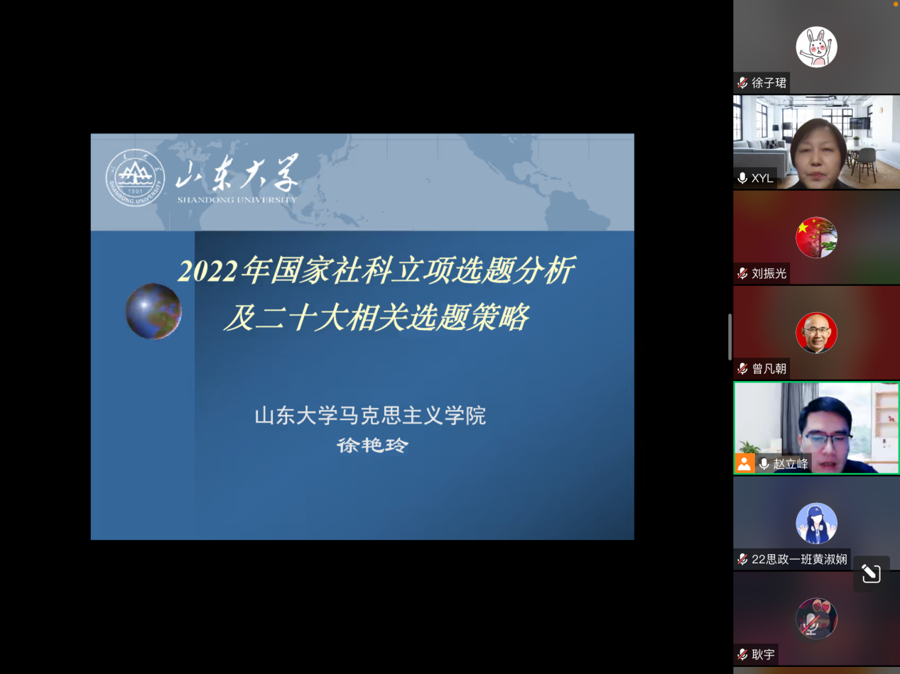 为进一步营造浓厚科研氛围,做好2023年国家社科基金项目的申报准备工作,12月8日,由马克思主义学院主办的第59期“国是讲坛”通过腾讯会议举行。山东大学马克思主义理论学科学术带头人、国家社科基金重大项目首席专家徐艳玲教授受邀作题为“基于自身科研感悟谈国家社科立项选题及二十大相关选题策略”的辅导报告。报告由马克思主义学院院长赵立峰教授主持,学院全体师生共三百余人线上聆听学习。