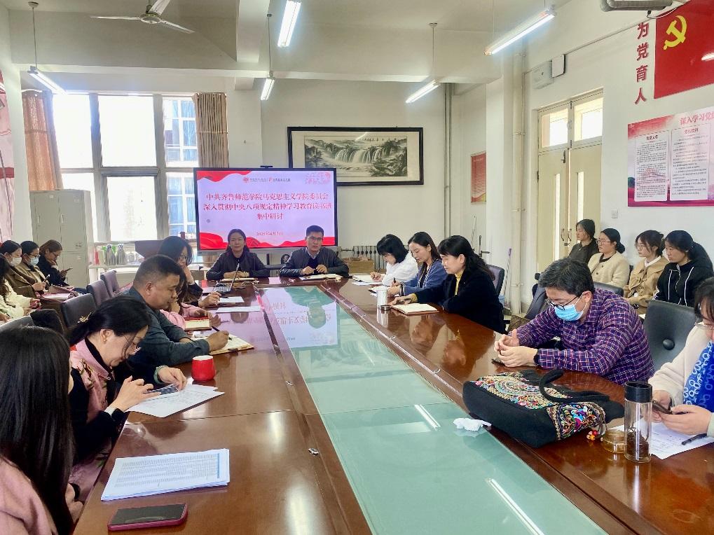 4月3日,马克思主义学院在学院会议室开展深入贯彻中央八项规定精神学习教育读书班集中研讨。学院全体师生党员参加研讨。会议由学院党委书记郭百灵主持。