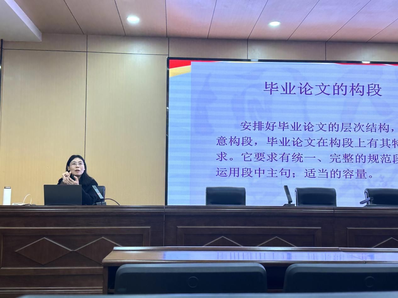 讲座的核心重点落在开题报告与文献综述撰写上。孙晓华副教授指出,文献综述是奠定论文学术根基的关键,需系统梳理国内外研究现状,精准提炼现有研究的成果与不足,明确自身研究的切入点与创新点,切忌简单堆砌文献。她结合学术写作实例,讲解了文献梳理与述评的实用方法,为同学们开展后续研究提供了清晰指引。