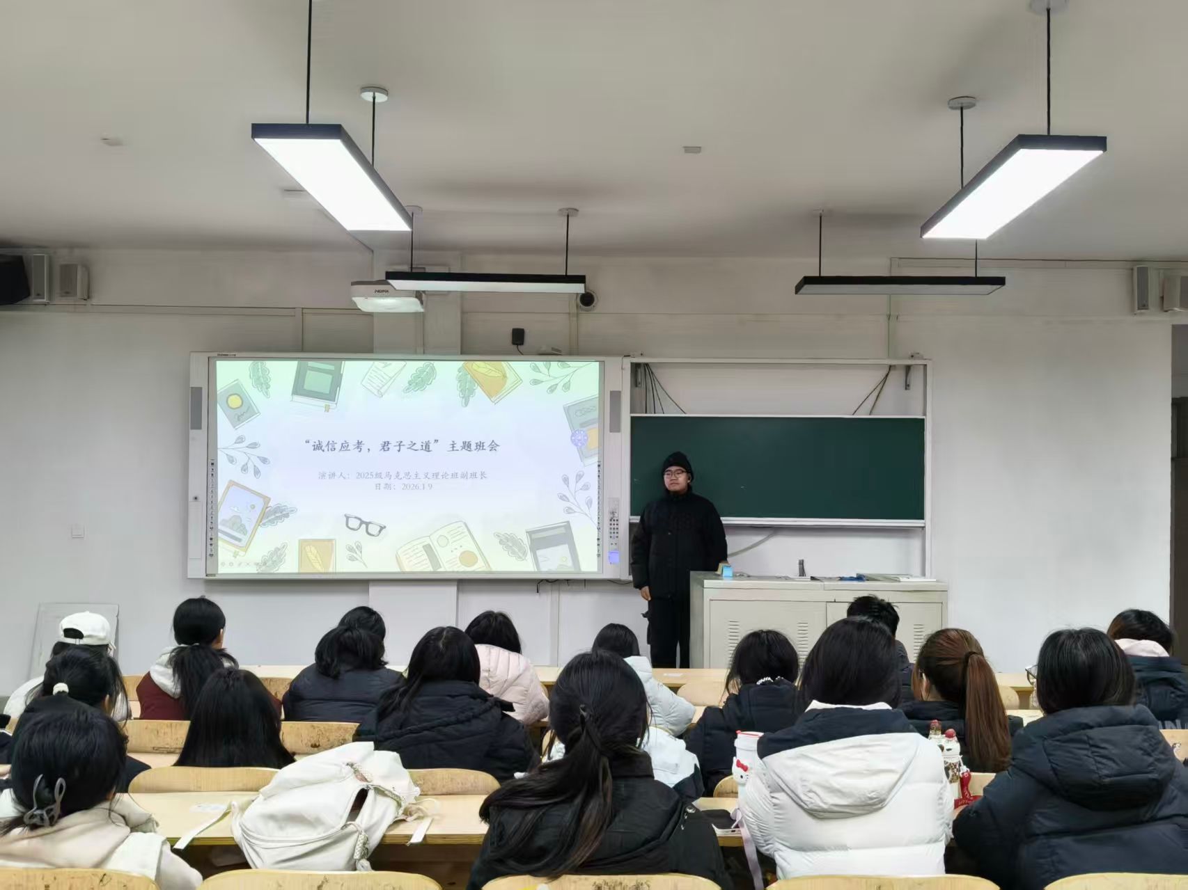 为深化新时代诚信教育内涵,强化学生的诚信应考意识,共建公平有序的考试环境,2026年1月7日至9日,马克思主义学院在2号教学楼A317、A310、A202教室召开诚信考试主题班会。马克思主义学院2024级、2025级全体同学参加会议,由各班副班长主持。