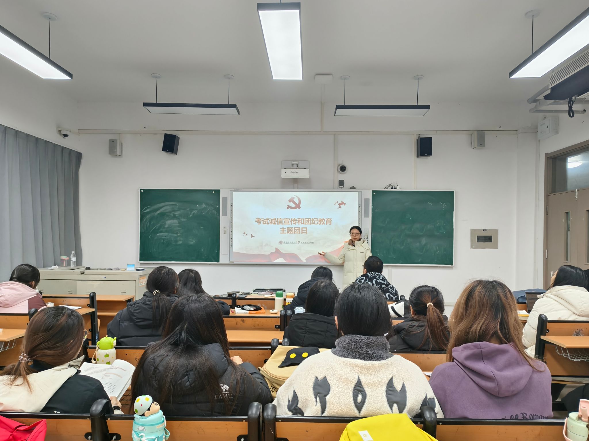 主讲同学以教育部关于考风考纪的相关规定与《中国共产主义青年团纪律处分条例(试行)》精神为切入点展开阐述,从学术公平、个人信誉与社会责任的角度,分析了诚信应考对于维护教育公平、塑造健全人格的重要意义;指明诚信考试不仅是个人品格的试金石,更是不可逾越的底线。同时,主讲同学系统解读了团纪的基本内涵与具体要求,强调团纪是共青团组织保持先进性和战斗力的根本保障,是维系团组织凝聚力、规范团员行为、确保组织目标落地的核心准则;引导同学们在学习和生活中自觉将团纪内化为行为准则。