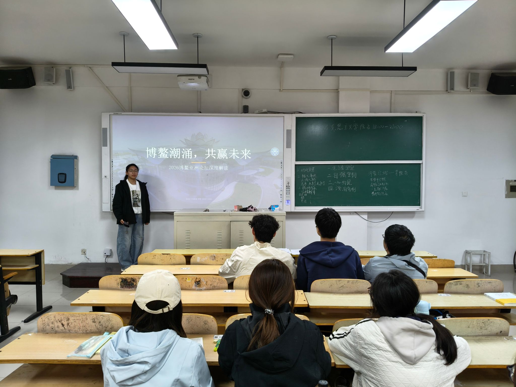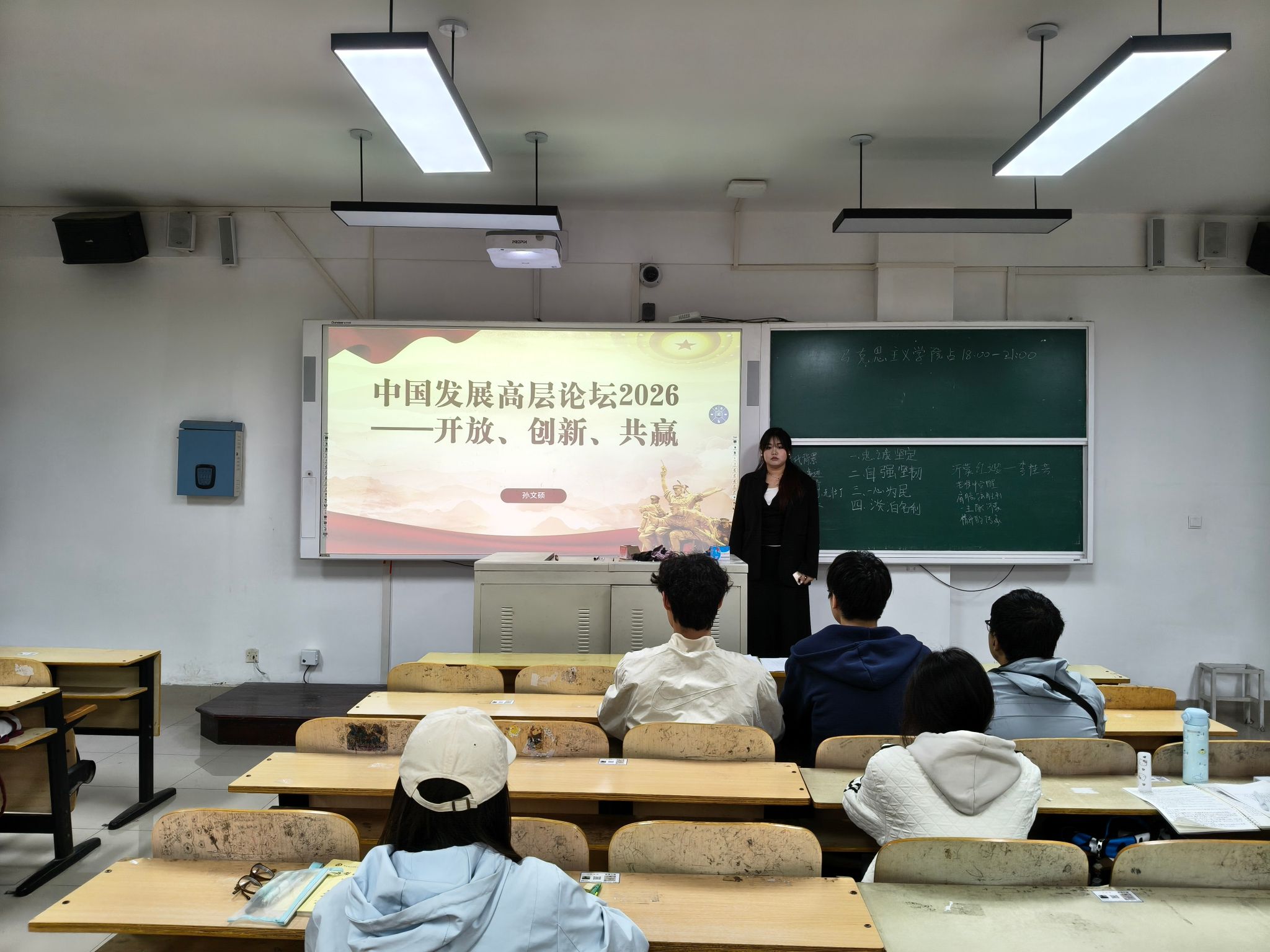 本次时政述评围绕近期时政热点展开,刘羽洁、孙文硕、冯贾琪等九位同学担任主讲人。刘羽洁同学以3月23日习近平总书记在河北雄安新区考察并主持召开深入推进雄安新区高质量建设和发展座谈会为主题,分享了雄安新区的发展前景与战略意义;孙文硕同学解读了3月22日至23日在北京举办的中国发展高层论坛2026年年会,阐述了中国发展的长远布局与持续动力;冯贾琪同学聚焦博鳌亚洲论坛成立25周年的热点,回顾了论坛在促进亚洲和世界发展中的重要作用;张安晨同学介绍了3月23日国新办举行新闻发布会介绍专利转化运用专项行动(2023—2025年)实施情况的新闻。此外,徐心彤、谷晨、丛彦雨等同学也就时政热点进行述评。