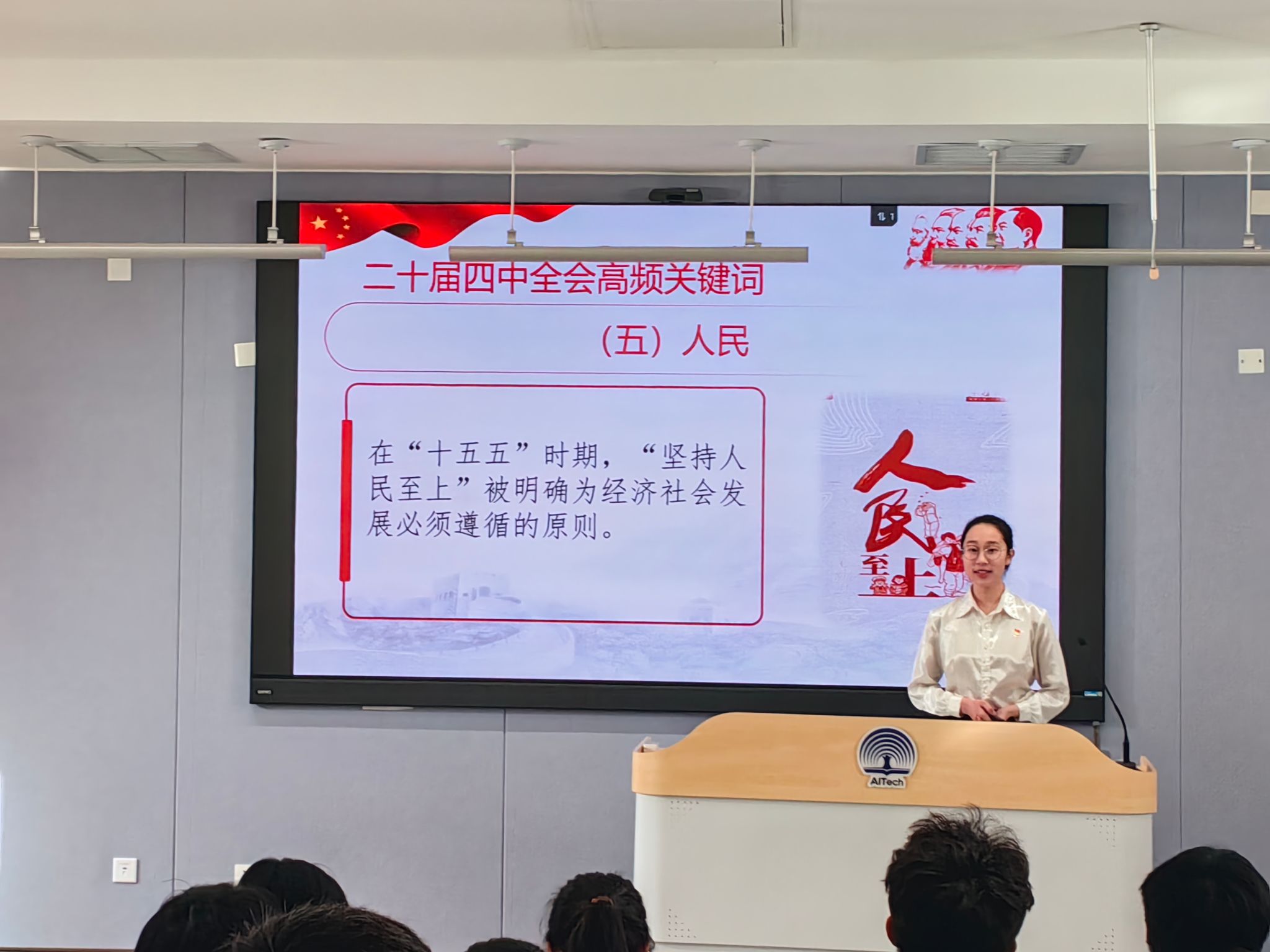 宣讲中,弭书琪同学以清晰的逻辑框架系统阐释党的二十届四中全会精神核心要义,结合详实理论解读与自身学习体会,深刻点明“十五五”时期作为基本实现社会主义现代化的关键夯实期、全面发力期,在国家发展进程中承前启后的重要战略地位。她立足新时代马克思主义理论发展成果,以通俗化表达拆解宏大战略叙事,深入解读“教育、科技、人才一体化推进”等重大部署的深远意义,帮助现场学子明晰国家发展蓝图与青年成长成才的内在契合点,推动理论学习入脑入心。