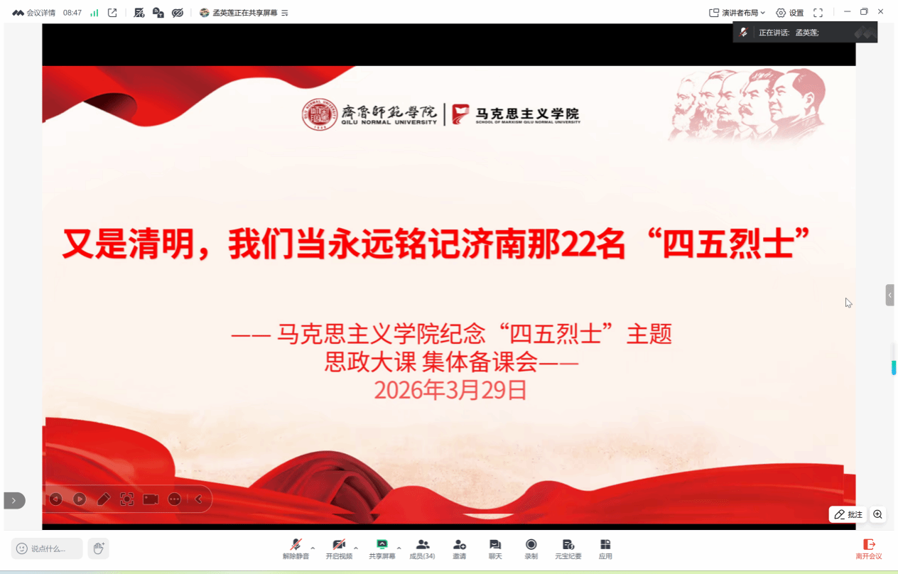 清明节到来前夕,为深入开展红色教育,缅怀先烈,用好本土革命历史资源,扎实推动齐鲁师范学院万名学生“大思政课”建设,马克思主义学院于3月29日召开线上专题集体备课会,隆重纪念“四五”烈士热血沃泉城九十五周年。学院相关负责人及全体思政课教师参加会议。